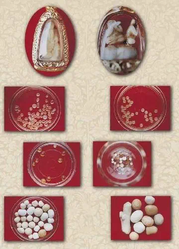 अजान मन के शरीर का दाह संस्कार के बाद एकत्रित हड्डी के टुकड़े अब विभिन्न पारदर्शी और अपारदर्शी रंगों में क्रिस्टल जैसे अवशेषों में परिवर्तित हो गए हैं।