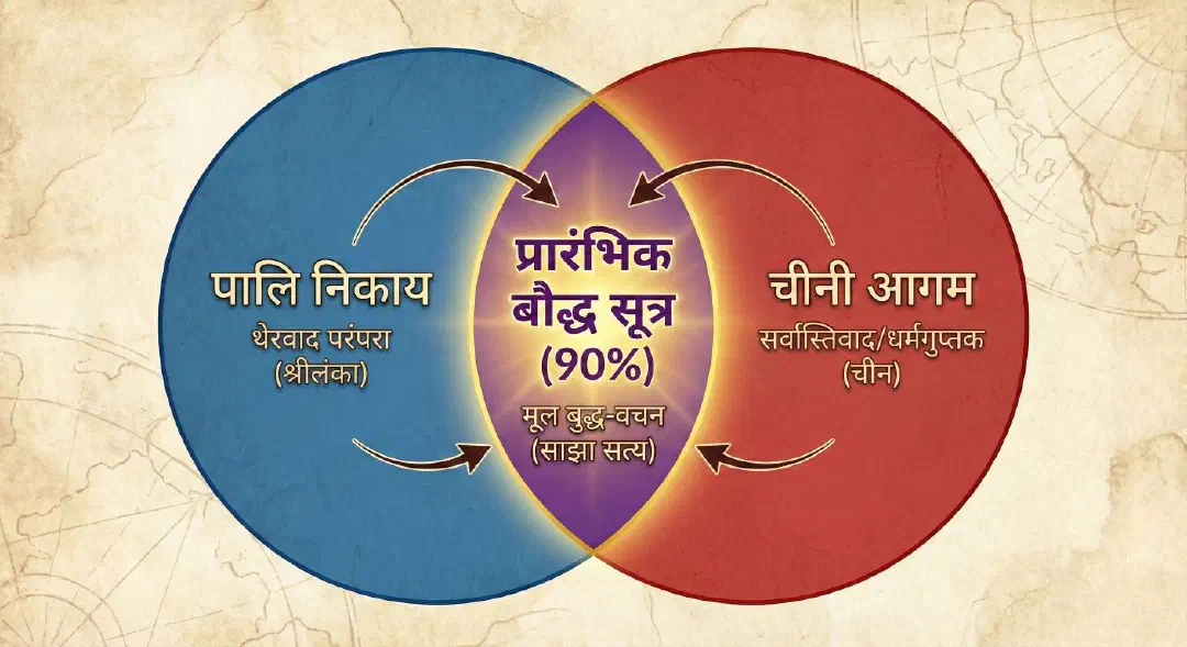 इतिहास की एक घटना हमारे लिए वरदान बन गई। जब बौद्ध संघ अलग-अलग संप्रदायों (जैसे थेरवाद, सर्वास्तिवाद, धर्मगुप्तक आदि) में बंटा, तो वे अपने साथ “मूल सूत्रों” का बंडल लेकर अलग-अलग दिशाओं में चले गए।